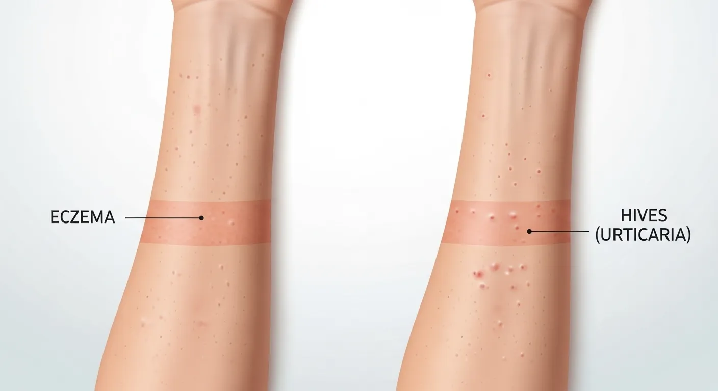 The difference between eczema or hives is mainly about duration and appearance. Eczema is a long-term condition with dry, itchy patches that need ongoing care. Hives are a sudden reaction that causes raised, swollen welts and usually fade quickly. While they can look alike, their causes and treatments are different.